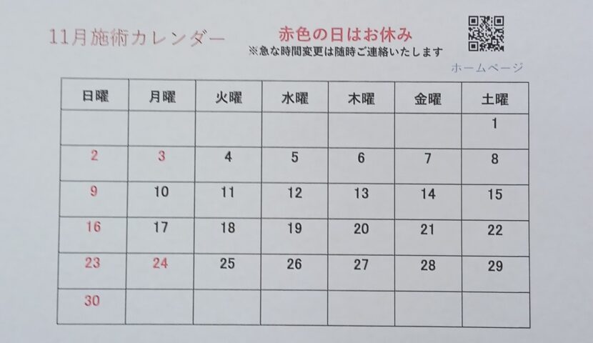 11月の施術スケジュールをお知らせいたします📅